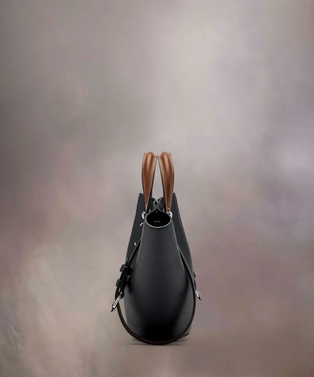 円錐型のクラシカルなシルエットに、コントラストカラーのストラップが洗練されたムードを添えます。ストラップは2WAY仕様で、手持ち・ショルダーどちらでも楽しめる設計。