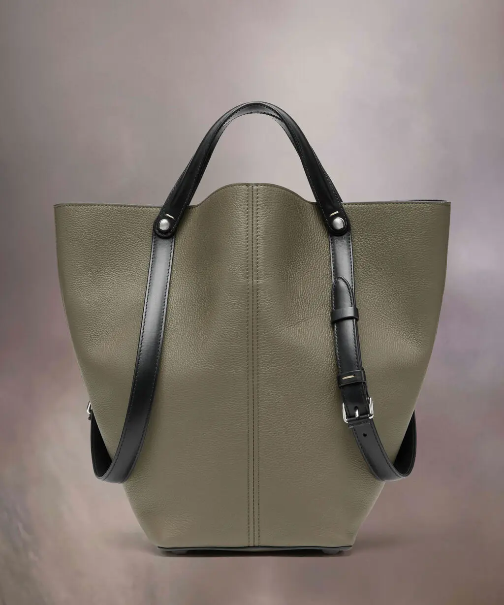 台形型のシルエットに、2WAY仕様のコントラストストラップを組み合わせることで、実用性とモード感を両立。